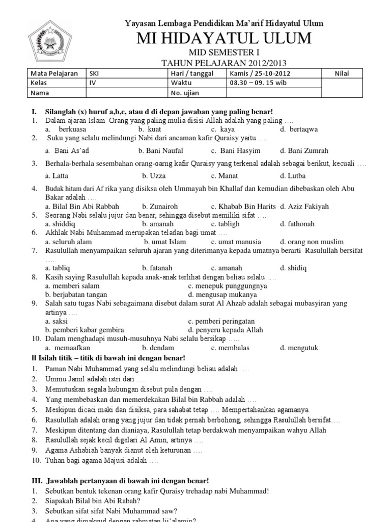 Soal Ujian Ski Kelas 4 Semester 1 / Soal Siap Uambd Mi Mapel Ski Tahun 2019 Informasiguru Com : Soal uts ski kelas 4 semester 2 dan kunci jawaban.. Nah sobat demikianlah yang dapat kami bahas mengenai pembahasan soal penjas kelas 4 lengkap dengan kunci jawabannya, semoga dengan artikel ini dapat berguna dan bermanfaat untuk kita semua, sekian dan terima kasih. Ski kelas 4 mi semester 1. Soal uas ski kelas 11 sumber : Lengkap panduan dan contoh penyusunan soal ujian sekolah tingkat smp tahun 2021/2022. Berilah tanda silang (x) pada salah satu huruf a, b, c dan d pada jawaban yang paling tepat!